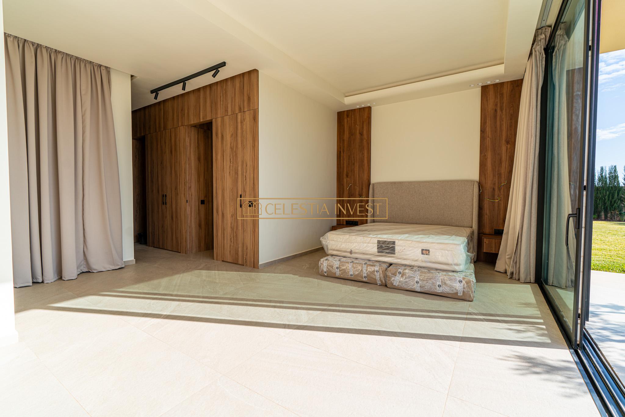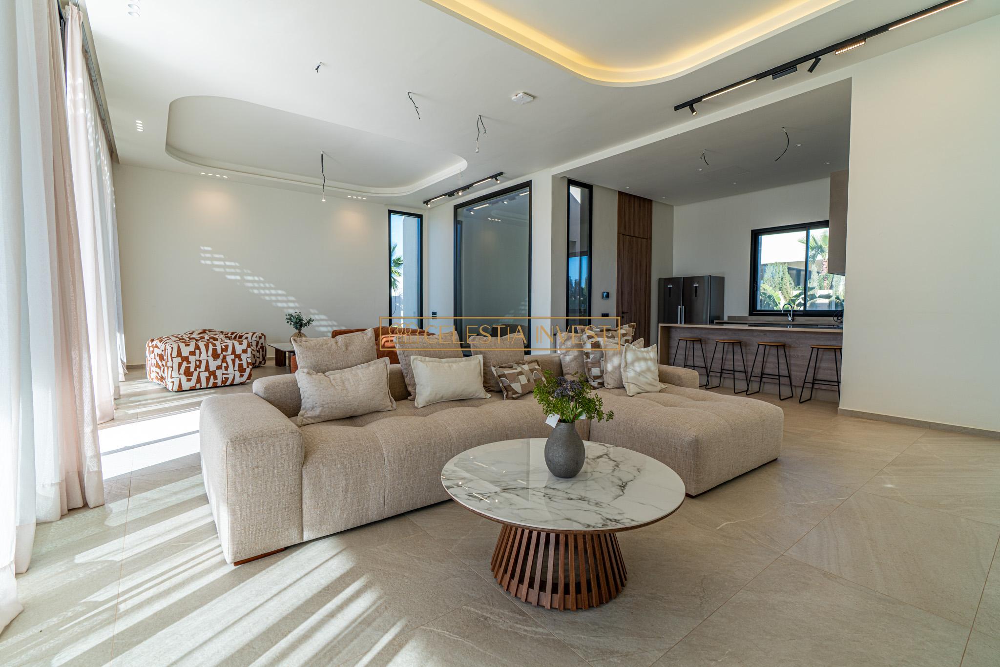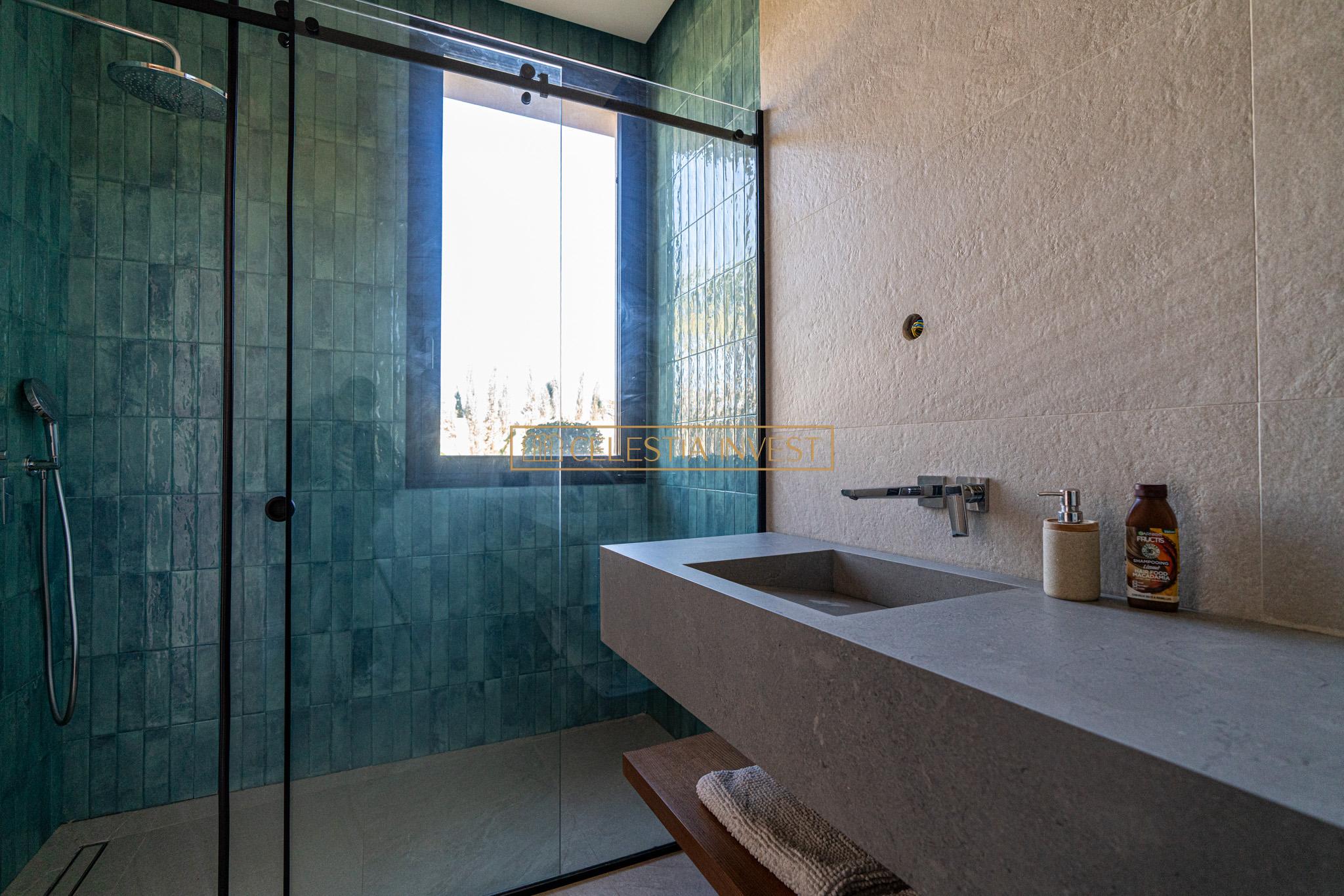 The night area consists of two bedrooms with en-suite bathrooms, built-in wardrobes, terraces, and reversible air conditioning. A junior master suite with bathroom and dressing room, as well as a spacious master suite featuring a dressing room, bathroom, and private terrace, offer optimal comfort and complete privacy. The villa also includes guest toilets.