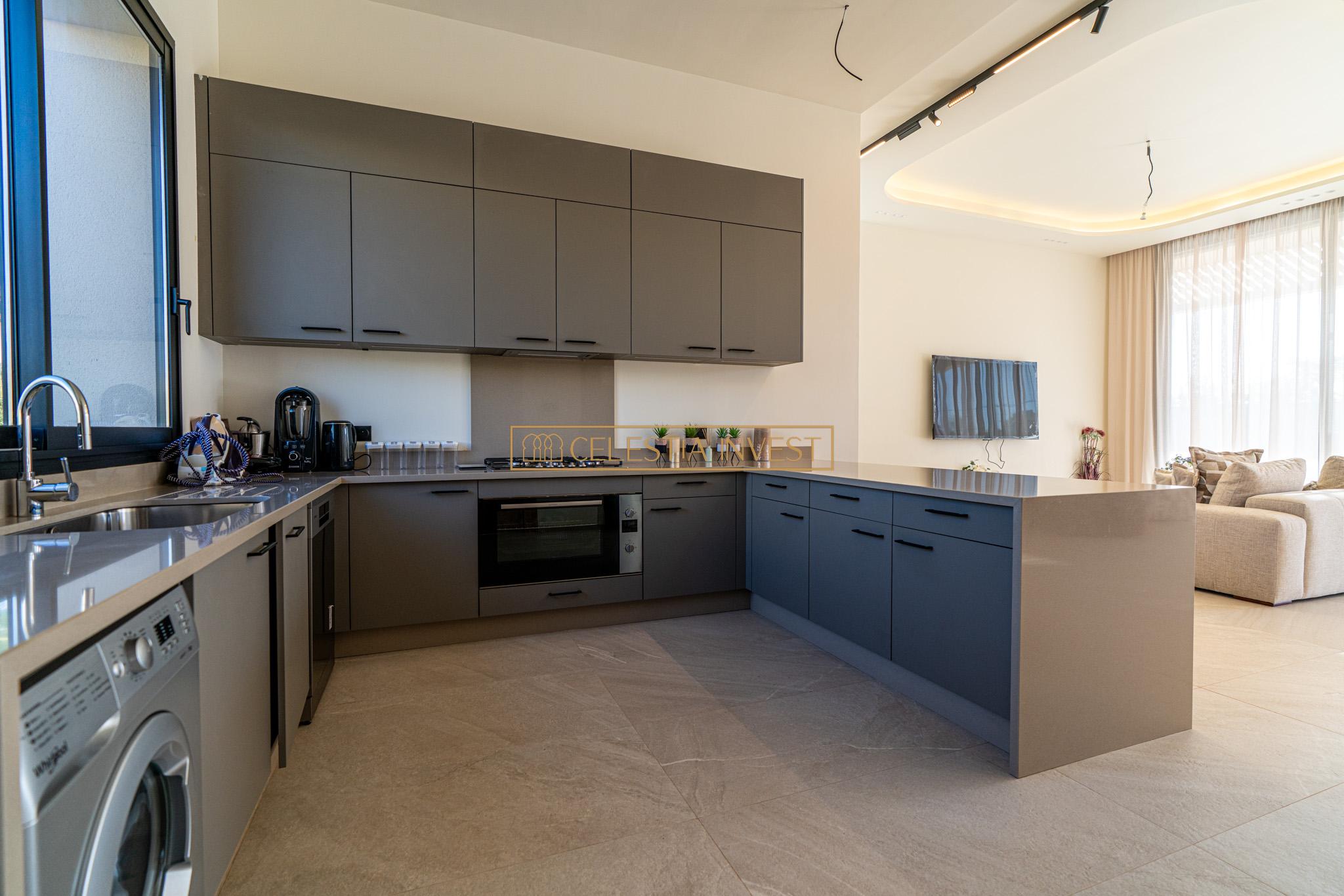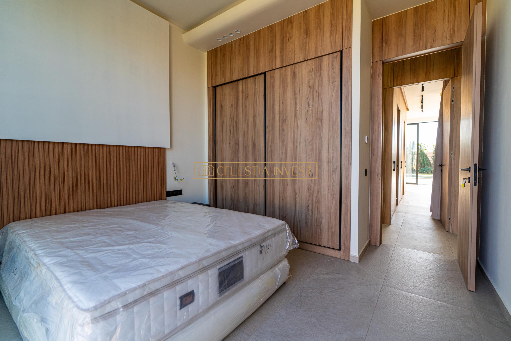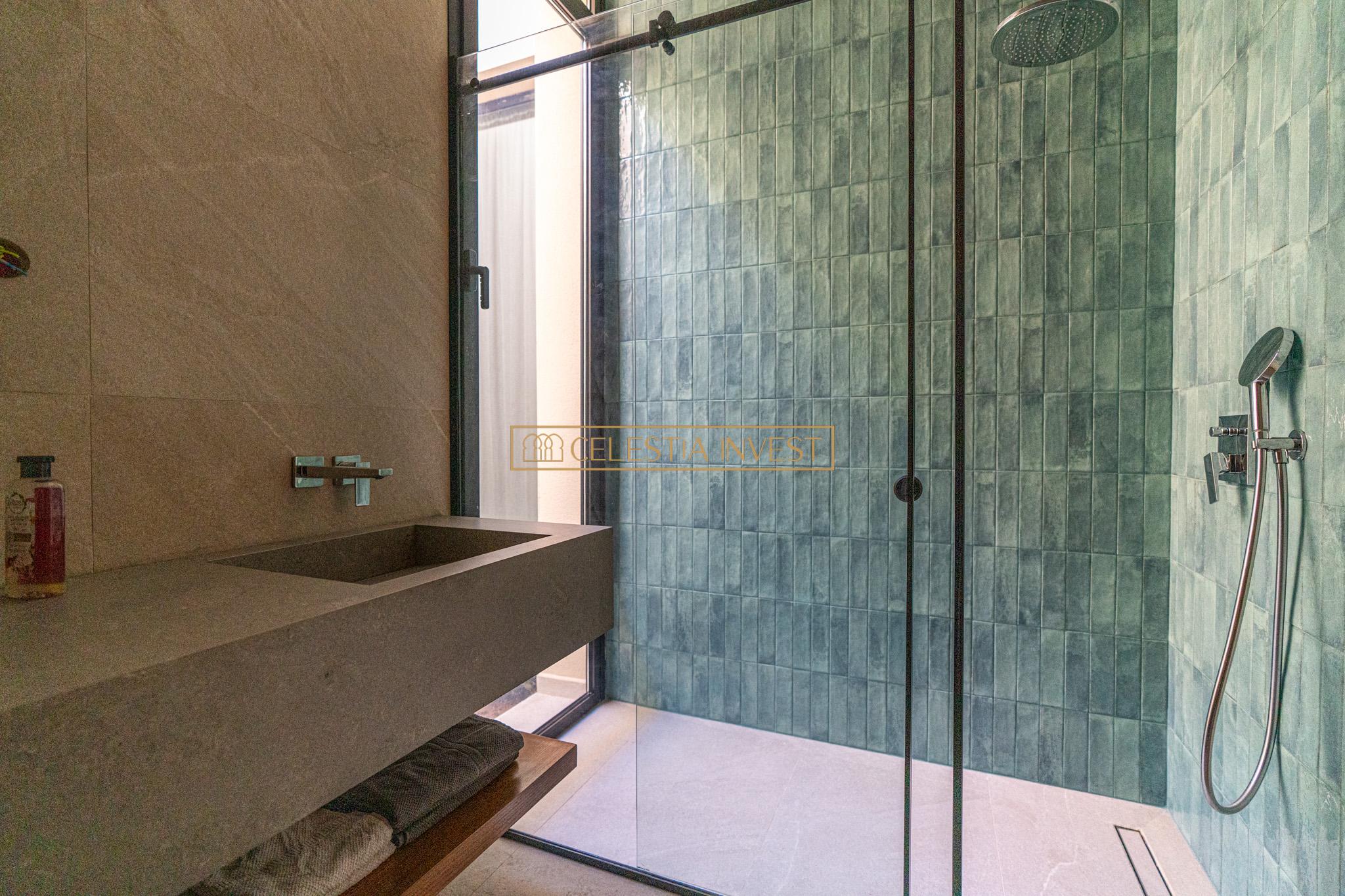The night area consists of two bedrooms with en-suite bathrooms, built-in wardrobes, terraces, and reversible air conditioning. A junior master suite with bathroom and dressing room, as well as a spacious master suite featuring a dressing room, bathroom, and private terrace, offer optimal comfort and complete privacy. The villa also includes guest toilets.