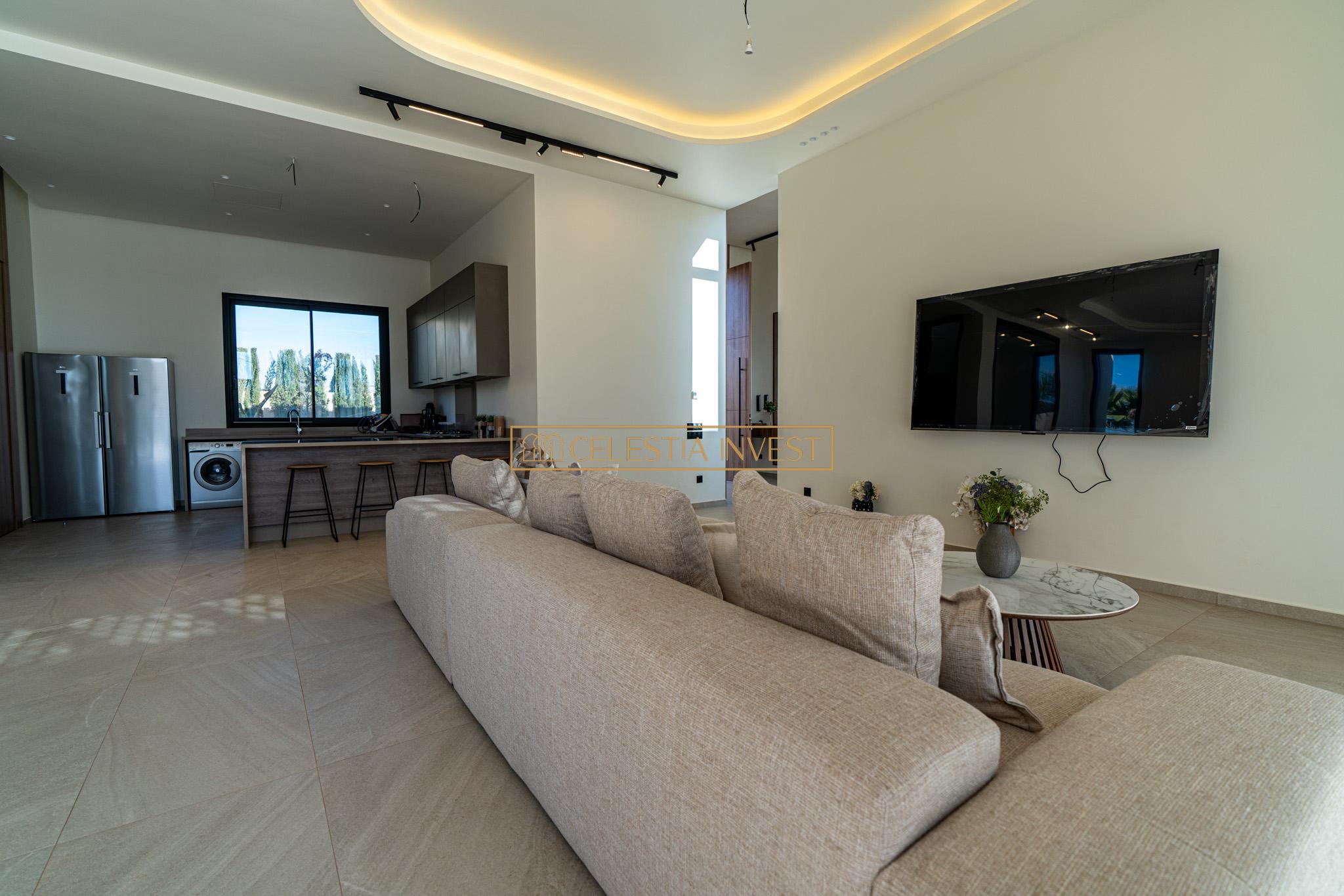 The villa is organized around a large, bright living room with wide bay windows opening directly onto the terrace and garden, an interior patio adding a touch of charm, and a welcoming dining area. The fully equipped open-plan kitchen completes this living space designed for both pleasure and functionality.