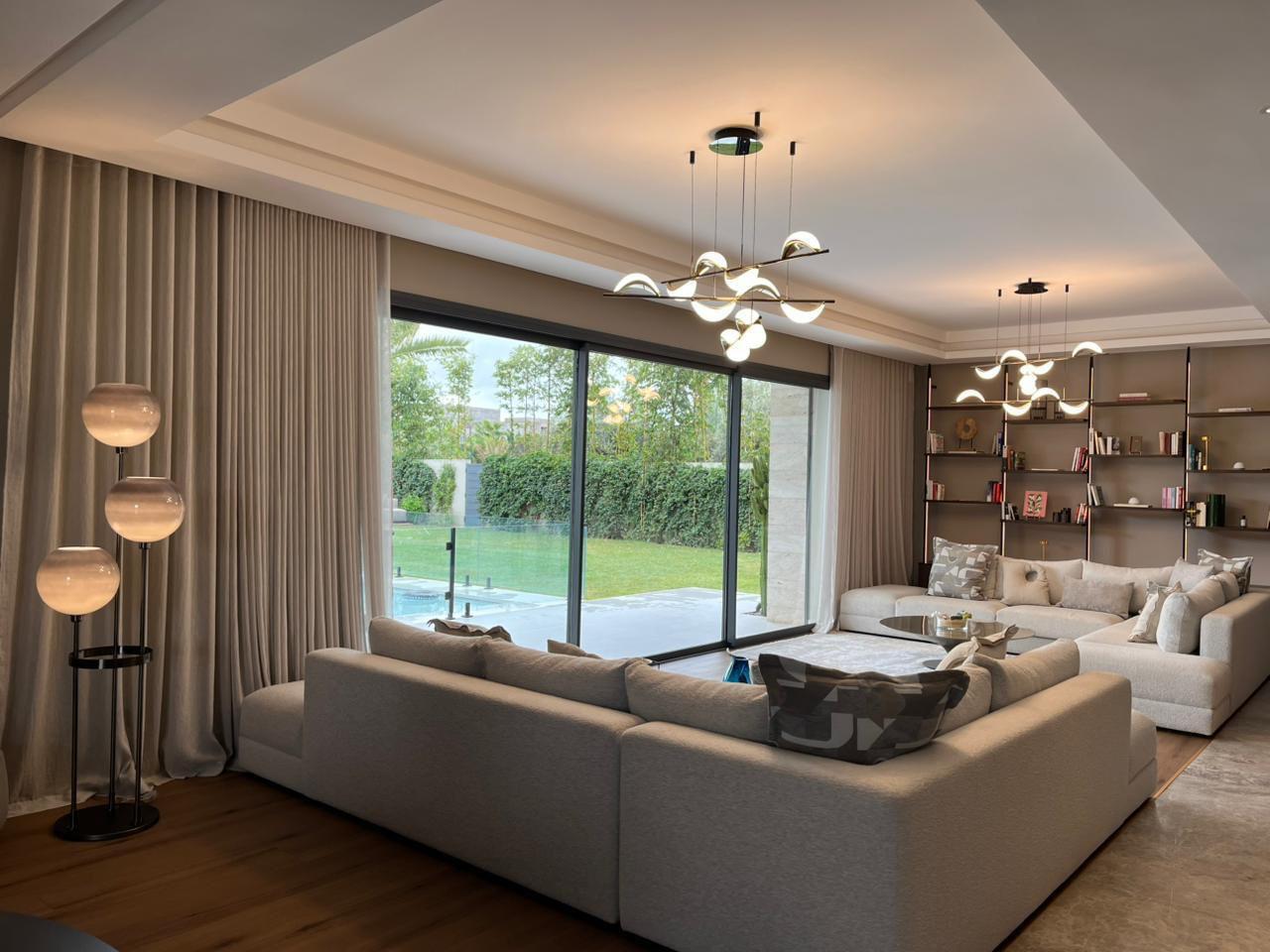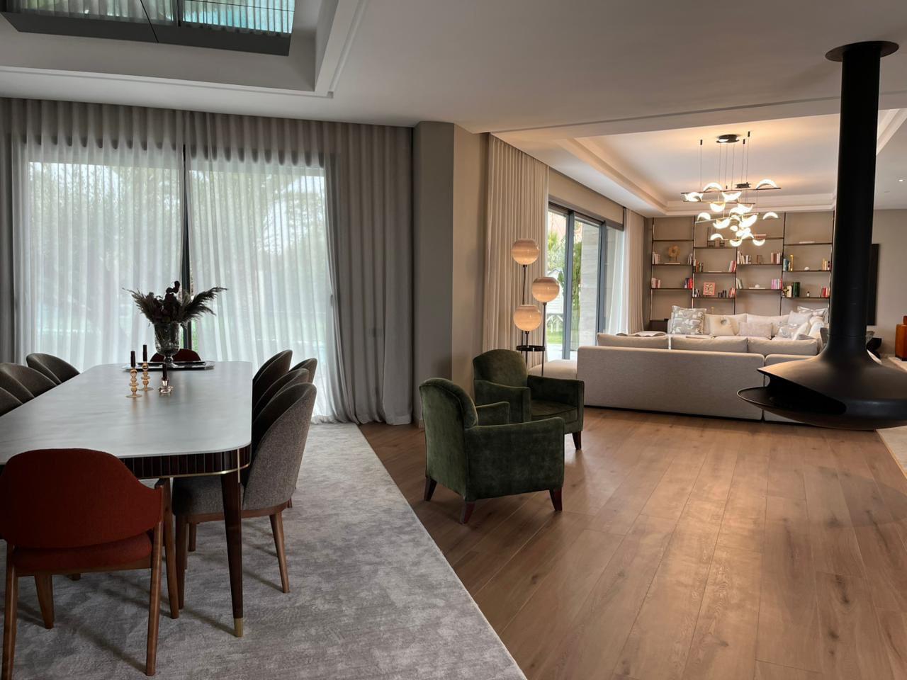 Les espaces de réception sont généreux et élégants, avec plusieurs salons ouverts sur le jardin et la piscine. La propriété dispose également de deux cuisines entièrement équipées, l’une à l’étage et l’autre au sous-sol, d’une buanderie, d’un WC invités, ainsi que de deux chambres dédiées au personnel avec leur salle de bain.