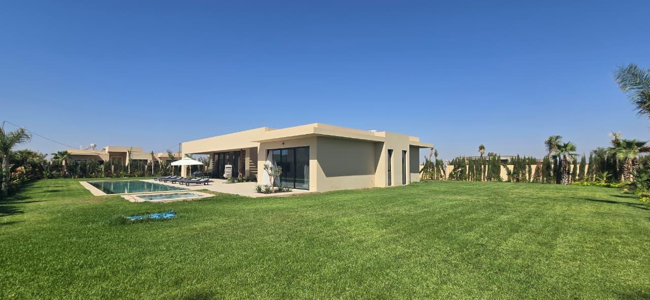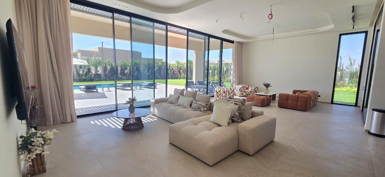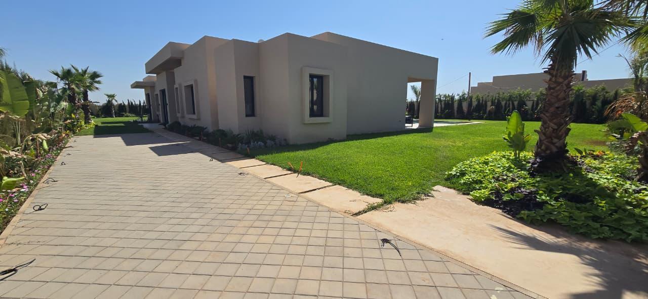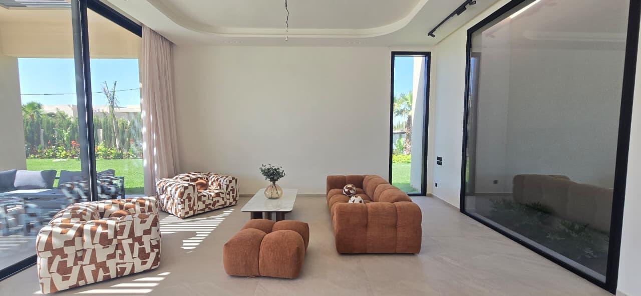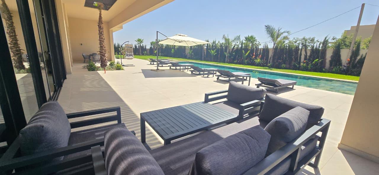 Située au sein d’une résidence privée et parfaitement sécurisée sur la route de Ouarzazate, à seulement vingt minutes du centre de Marrakech, cette superbe villa de plain-pied offre un cadre de vie exceptionnel alliant confort, modernité et sérénité. Édifiée sur un terrain de 2.126 m² et développant 307 m² habitables, elle séduit dès l’entrée par son atmosphère chaleureuse et ses beaux volumes. La villa s’articule autour d’un grand salon lumineux, doté de larges baies vitrées ouvrant directement sur la terrasse et le jardin, d’un patio intérieur apportant une touche de charme, ainsi que d’une salle à manger conviviale. La cuisine américaine, entièrement équipée, complète cet espace de vie conçu pour le plaisir et la fonctionnalité. La partie nuit se compose de deux chambres avec salles de bain privatives, placards intégrés, terrasses et climatisation réversible. Une mini master avec salle de bain et dressing, ainsi qu’une grande master suite bénéficiant d’un dressing, d’une salle de bain et d’une terrasse privée, offrent un confort optimal et une intimité totale. La villa dispose également de toilettes invités. Les extérieurs ont été soigneusement aménagés pour profiter pleinement du climat ensoleillé de Marrakech : une magnifique piscine de 19 mètres, un vaste jardin arboré et engazonné, une terrasse couverte, une terrasse ensoleillée, des transats, parasols et un agréable salon extérieur. Un jacuzzi vient compléter ce cadre idéal pour se détendre. La propriété comprend également une chambre du personnel avec salle de bain et climatisation, un garage pouvant accueillir jusqu’à quatre véhicules, ainsi qu’un système de climatisation réversible présent dans l’ensemble de la villa.