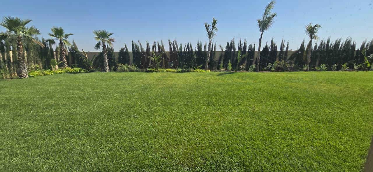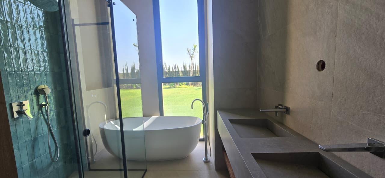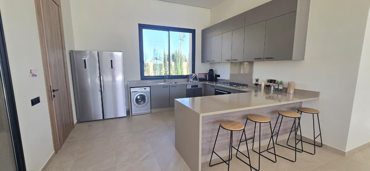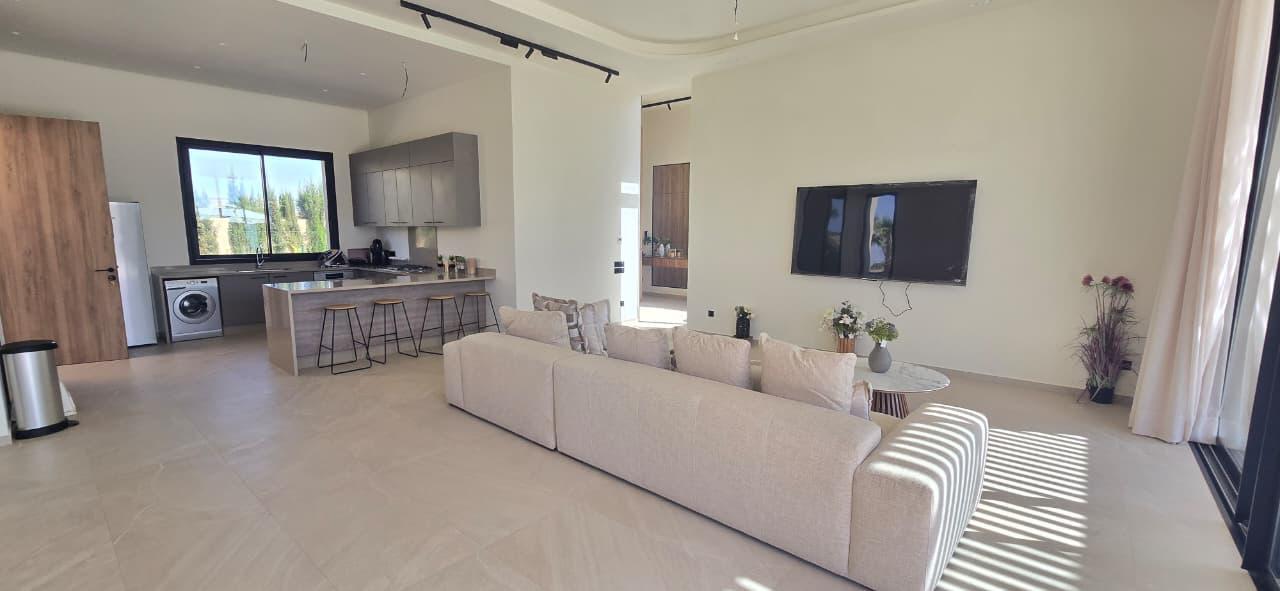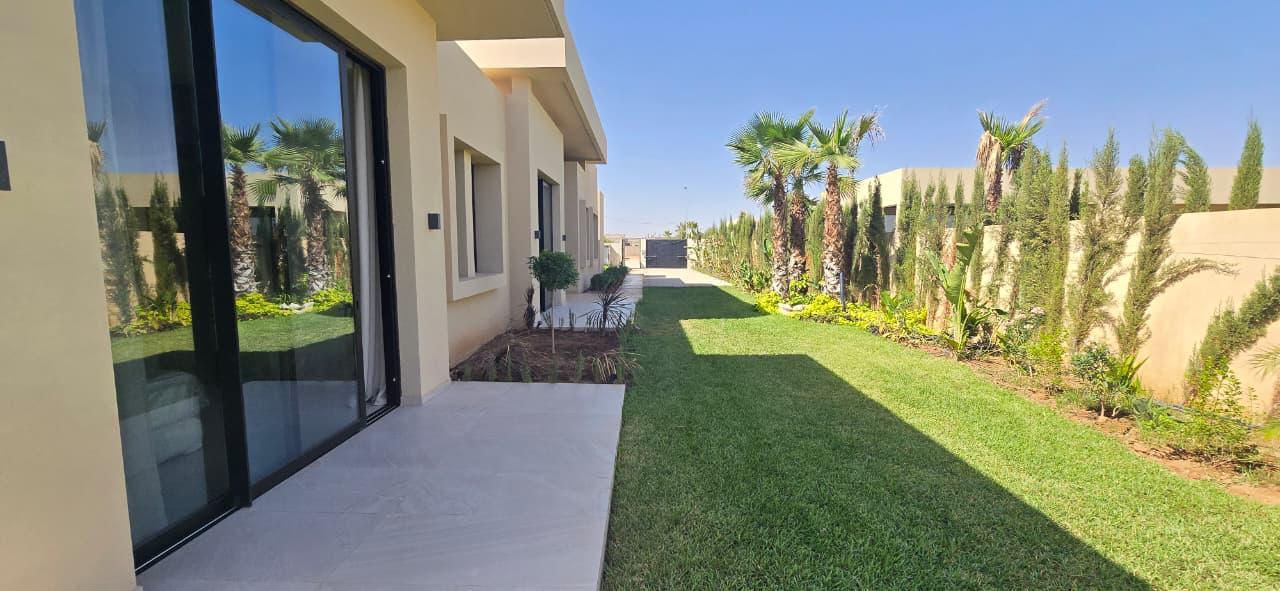 Située au sein d’une résidence privée et parfaitement sécurisée sur la route de Ouarzazate, à seulement vingt minutes du centre de Marrakech, cette superbe villa de plain-pied offre un cadre de vie exceptionnel alliant confort, modernité et sérénité. Édifiée sur un terrain de 2.126 m² et développant 307 m² habitables, elle séduit dès l’entrée par son atmosphère chaleureuse et ses beaux volumes. La villa s’articule autour d’un grand salon lumineux, doté de larges baies vitrées ouvrant directement sur la terrasse et le jardin, d’un patio intérieur apportant une touche de charme, ainsi que d’une salle à manger conviviale. La cuisine américaine, entièrement équipée, complète cet espace de vie conçu pour le plaisir et la fonctionnalité. La partie nuit se compose de deux chambres avec salles de bain privatives, placards intégrés, terrasses et climatisation réversible. Une mini master avec salle de bain et dressing, ainsi qu’une grande master suite bénéficiant d’un dressing, d’une salle de bain et d’une terrasse privée, offrent un confort optimal et une intimité totale. La villa dispose également de toilettes invités. Les extérieurs ont été soigneusement aménagés pour profiter pleinement du climat ensoleillé de Marrakech : une magnifique piscine de 19 mètres, un vaste jardin arboré et engazonné, une terrasse couverte, une terrasse ensoleillée, des transats, parasols et un agréable salon extérieur. Un jacuzzi vient compléter ce cadre idéal pour se détendre. La propriété comprend également une chambre du personnel avec salle de bain et climatisation, un garage pouvant accueillir jusqu’à quatre véhicules, ainsi qu’un système de climatisation réversible présent dans l’ensemble de la villa.