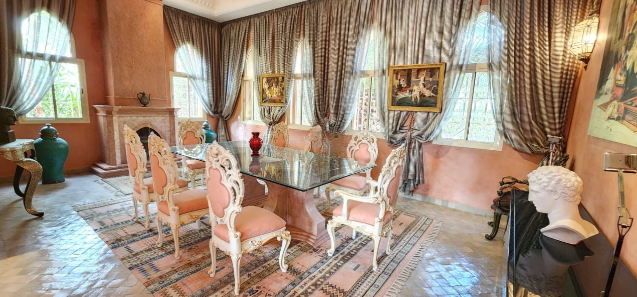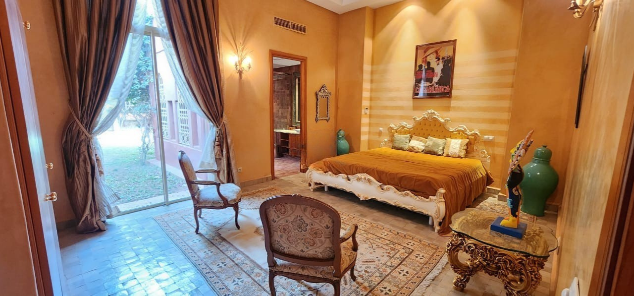 Les extérieurs constituent l’un des atouts majeurs de cette propriété. Le jardin mature, richement arboré, entoure une magnifique piscine extérieure aménagée avec transats et parasols, invitant à la détente sous le soleil de Marrakech. De nombreuses terrasses, un solarium, une cour intérieure, ainsi qu’un élégant patio avec fontaine créent une véritable atmosphère de maison de campagne de luxe. La propriété dispose également d’un terrain de tennis privé, d’une salle de sport, et d’un puits, offrant une autonomie et des prestations rares sur le marché.